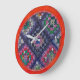 Granny square patterned afghan in multiple colours. Framed with a red ring that looks 3D. White numerals .