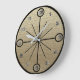 Modernist style with metallic looking numerals. 12, 3, 6, and 9 are encircled with the end points of crossing lines. Other numerals have thinner, shorter lines pointing to them. Background is a beige colored linen texture.