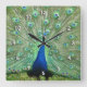 Peacock is all "eyes" on the time. Standing proud, the bird has bright green feathers accented with the royal blue centres and head and body feathers of blue. White numerals with drop shadow are at the edge.