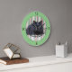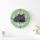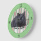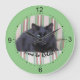 Black cat relaxing on striped cushions. Cushions are green, red, beige and white vertical stripes. Outer rim of clock is matches the green in the cushions. Beneath the cat is text "Time to Relax!" You may personalise with your own image.