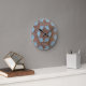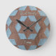 "Quilting Time" is a faux stitched text at top and bottom of the clock face. Quilt block in brown and blue "castle" pattern. The central "castle" is a brown star shape, surrounded by the "6 sided wall" with the "watch towers" extending out from the middle of the walls. The points of the "wall" mark the 1-12 number positions on the clock.