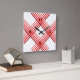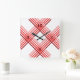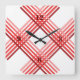 Red lines in five shades dark to light, bottom to top. Four sets of stripes are placed diagonally, forming a square in the middle that is at right angles to the corners of the square coaster. Dark Numerals for 12, 9, 6, and 3.