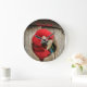 Clock with green wing macaw parrot in barrel. Green-wing macaws are large red parrots, similar to a Scarlet macaw. This bird is sticking his head out of his house looking at the camera in a funny way.