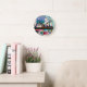 The clock did not take as long to arrive as I thought it might and was extremely well packaged. I didn't do the measurements so I didn't realize it is a little smaller than the average clock but that does not matter (just make sure you check if that's important to you).It is really nifty! It seems very solid and well made not flimsy at all. It has been going well and has kept good time in its few weeks on my wall. Nice product. Gets noticed too! Nicer in real life than the picture but true to the picture