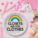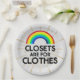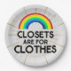 Gay pride themed party supplies features large rainbow with "closets are for clothes" in bold black text on light grey background with gold starburst