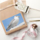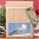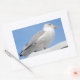 Closeup herring gull perched on boat cabin on blue rectangular sticker