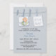 Blue clothesline with baby boy sitting in umbrella and 'It's a boy" text in photo frames hanging from the clothesline. Background is subtle blue stripes.
