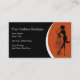 Clothing boutique business cards with image of fashion lady and dress frame along with text space you can personalise and burnt orange design element. Change the black background colour and make this your own. Best business cards for a dress shop, clothing, or seamstress.