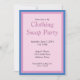 Bored with your current clothes? Planning a clothing swap party? This invitation allows you to input your customised date, location, and RSVP information. On the back is a picture of a dress and a skirt. Card colour scheme is pink and blue.