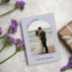Beautiful and elegant photo thank you card to send to your wedding guests. Double sided wedding thank you card with two photos, one in an arch shaped frame with LOVE & THANKS written in a curve. Cloud grey wedding thank you card with your names in a modern grey brush script. Grey and white photo thank you cards for the newly weds. Add your own personal thank you message to the back of the double-side photo thank you card.