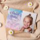 Dreamy birthday party invitation card featuring watercolor illustration of pink, blue, and pink sky with stars and clouds.. The text says "We are on Cloud Nine." Perfect for your girl's 9th birthday. Add your child's photo on this invite.