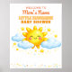 A joyful baby shower design featuring a smiling sun surrounded by soft blue clouds and sparkling golden stars. The bright yellow sunshine and gentle sky colors create a warm and welcoming atmosphere inspired by dreamy sky themed celebrations. This playful illustration highlights clouds, stars, and sunny sky elements, bringing a cheerful and charming touch to baby shower decorations and celebration setups.
