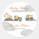 A "Baby Under Construction" baby shower classic round sticker featuring soft grey watercolor clouds, with a dreamy, calming design. The gentle clouds provide a whimsical touch, creating a serene backdrop that complements the theme while adding a playful, yet elegant detail to your baby shower favours or invitations.