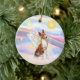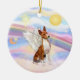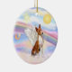 A Basenji angel floats in heaven's fluffy clouds with a shining sun and star and moon in the distance