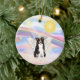 A Border Collie angel floats in heaven's fluffy clouds with a shining sun and star and moon in the distance