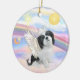 A black and white Lhasa Apso angel floats in heaven's fluffy clouds with a shining sun and star and moon in the distance