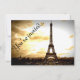Invitations feature cloudy skyline of Paris and Eiffel Tower.