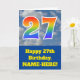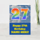 The front of this fun 27th birthday greeting card design features a cloudy blue sky depiction, along with the number "27" having a multicolored rainbow spectrum like gradient look. The front also features a birthday greeting message, including a customizable recipient name. The inside features a customized birthday greeting message, or could perhaps be cleared and left blank if a message is to be written by hand instead. A personalized birthday card like this might be a fun way to send birthday wishes to somebody who is celebrating their twenty seventh birthday. [~Z0000370]