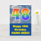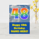 The front of this fun 48th birthday greeting card design features a representation of a cloudy blue sky, along with the number "48" having a multicolored rainbow spectrum like gradient look. The front also features a birthday greeting message, including a customised recipient name. The inside features a customisable birthday greeting message, or could perhaps be cleared and left blank if a message is to be written by hand instead. A custom birthday card like this might be a fun way to send birthday wishes to somebody who is celebrating their forty eighth birthday. [~Z0000370]