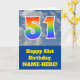 The front of this fun 51st birthday greeting card design features a depiction of a cloudy blue sky, along with the number "51" having a multicolored rainbow spectrum like gradient pattern. The front also features a birthday greeting message, including a customizable recipient name. The inside features a personalized birthday greeting message, or could perhaps be cleared and left blank if a message is to be written by hand instead. A personalized birthday card like this might be a fun way to acknowledge somebody’s fifty first birthday. [~Z0000370]
