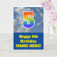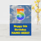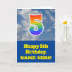 The front of this fun 5th birthday greeting card design features a cloudy blue sky depiction, along with the number "5" having a multicolored rainbow spectrum like gradient look. The front also features a birthday greeting message, including an editable recipient name. The inside features a customised birthday greeting message, or could perhaps be cleared and left blank if a message is to be written by hand instead. A personalised birthday card like this might be a fun way to send birthday wishes to somebody who is celebrating their fifth birthday. [~Z0000370]