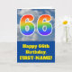 The front of this fun 66th birthday greeting card design features a depiction of a cloudy blue sky, along with the number "66" having a multicolored rainbow spectrum like gradient pattern. The front also features a birthday greeting message, including an editable recipient name. The inside features a customizable birthday greeting message, or could perhaps be cleared and left blank if a message is to be written by hand instead. A customizable birthday card like this might be a fun way to acknowledge somebody’s sixty sixth birthday. [~Z0000370]