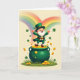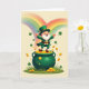 This card shows a cheerful leprechaun in the center, standing on a shiny emerald pot that’s spilling gold coins into the grass below. He wears bright green clothes with a tall hat and a gold buckle, and his snowy white beard and rosy cheeks frame a wide smile that feels like a friendly invitation 💚. His arms stretch open as if welcoming a close friend in for a laugh, and his sparkling eyes add a warm, companionable touch. Above him, a soft pastel 🌈 curves across the top background, echoing the sweep of his arms and giving the scene a gentle glow. Deep forest-green four-leaf clovers are scattered around a creamy beige backdrop, adding little pockets of luck throughout. The main greeting text sits near the top in green, with a smaller line underneath in gold that matches the coins and buckle ☘️. At the bottom, more coins rest among the green grass, with several shown mid-fall beside the pot’s glossy rim.