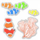 Clown fish stickers with sea coral. Fun party stickers for kids in bright, primary colours. Give as favours at "under the sea" themed birthday parties, or add to envelopes, packages or scrapbook pages.