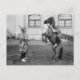 Old photo of girl in a clown outfit riding a horse doing a trick. Photo taken between 1915 and 1917.