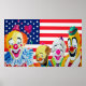 Clowns Love America Print. This painting depicts four Clowns in front of an American Flag. This painting would make an excellent gift for one who loves Clowns, Clowning and Circus.