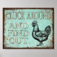 Cluck around and find out funny rustic chicken poster. With a faux scratched, rusty look.