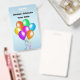 This name or identification badge has a cluster of colourful bright balloons in various colours with matching hanging ribbons on a light blue background. Back is light blue also. Customise your name and information with the templates.