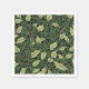 A foliage print with a light almost olive green or sage leaves interwoven into darker greens. A shade of hunter green or a dark forest green creates the large majority of the leaves. These on a background of black.