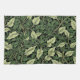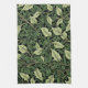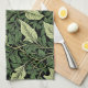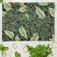 A foliage print with a light almost olive green or sage leaves interwoven into darker greens. A shade of hunter green or a dark forest green creates the large majority of the leaves. These on a background of black.