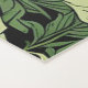 A foliage print with a light almost olive green or sage leaves interwoven into darker greens. A shade of hunter green or a dark forest green creates the large majority of the leaves. These on a background of black.