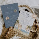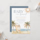 Bring a relaxed coastal vibe to your baby shower with this two-sided watercolor “Baby on Board” invitation by Redwood & Vine Design Co. The front showcases hand-painted artwork of palm trees, ocean waves, sandy shore, golden sun, and surfboards, while the reverse features a coordinating dusty blue background with tropical illustrations, gift registry details, and a scannable QR code for easy access to online registries. Ideal for a tropical, beach, or surf-inspired celebration, this invitation pairs natural beauty with practical details for a complete and elegant presentation.