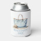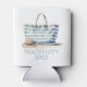 This cute coastal inspired can cooler features a blue and white stripe beach tote bag with hat. Personalise with your choice of name and special text in matching blue on the front and back.