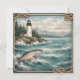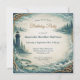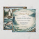 This coastal themed birthday party design features a serene ocean backdrop in soft seafoam blue and misty cream tones. A lighthouse stands along a rugged shoreline, framed by evergreen trees and distant coastal hills. Nautical rope details accent the corners, while salmon swim through textured waves at the bottom, adding movement and maritime charm. Elegant script highlights the words Birthday Party, balanced with clean serif lettering for the event details. The overall composition captures a relaxed seaside atmosphere, perfect for a nautical inspired celebration by the water.