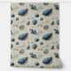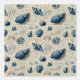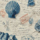 A beachy off white french script and red stamps with shells in blue hues for a coastal wallpaper.
