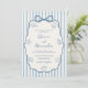 This dusty blue and ivory whimsical coastal wedding invitation features a coquette scalloped frame with a bow on a background of watercolor stripes, hand drawn beach seashell doodles, and handwriting script.