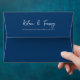 Complete your Coastal Blues wedding stationery with this elegant navy envelope, designed to coordinate beautifully with your beach, coastal, or nautical wedding suite. The exterior features a deep navy blue background with the couple’s names printed in a modern white handwriting script on the envelope flap, alongside a customizable return address for a polished, personal touch. Inside, a clean white color adds a crisp contrast that enhances the relaxed yet refined coastal aesthetic. Perfect for pairing with your invitations, details card, RSVP card, and the full Coastal Blues suite.