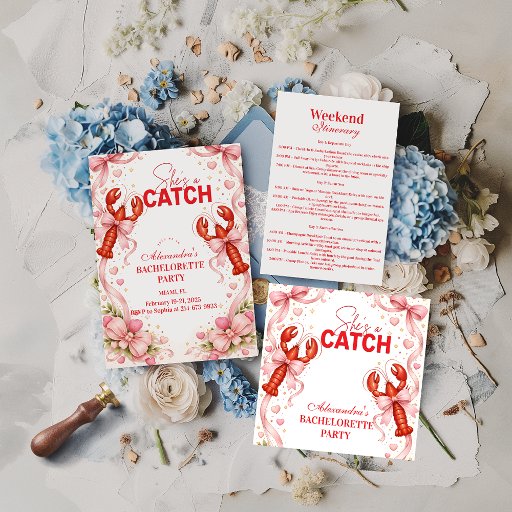 Celebrate the bride-to-be with a bold coastal bachelorette design featuring illustrated lobsters, playful nautical details, and a clean modern layout. Perfect for beach trips, Miami weekends, or seaside bachelorette parties, this invitation blends fun humor with a stylish ocean-inspired aesthetic. A great choice for brides who love coastal vibes with a confident, cheeky twist.