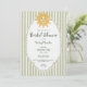 This whimsical coastal bridal shower invitation features a vintage sun motif, lace border, palm trees, and stylish sage green stripe background. Perfect for a beach or California destination wedding theme event. Created by Simply Farmhouse Press.