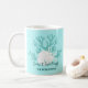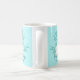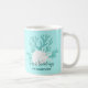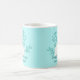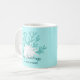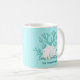 Personalise this beachy Christmas mug with for a unique gift or your own holiday decor. The mug features aqua blue glitter coral, white sand dollar and starfish, and the holiday message “Seas & Greetings”, on a light aqua blue background.
