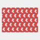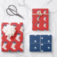 This coastal inspired set of gift wrap sheets feature classic Christmas stockings with red crabs and a blue bow on top on two of the sheets and a third sheet of white stars on dark blue.