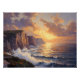 This painting captures a breathtaking coastal scene at sunset. Rugged cliffs rise dramatically from the ocean, their rocky surfaces illuminated by the warm golden light of the setting sun. The sea below is alive with movement, as waves crash against the base of the cliffs, sending up white sprays of foam. The sky is filled with vibrant hues of orange, yellow, and purple, while scattered clouds add depth and texture to the horizon. The peaceful yet powerful scene evokes a sense of awe and serenity, blending the raw beauty of nature with the tranquil glow of dusk.