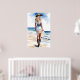 This beautiful coastal cowgirl themed watercolor poster features a girl in a white dress and cowboy hat and boots walking on the beach. The soft blue and white hues capture the essence of a coastal summer.