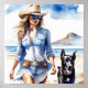 This beautiful coastal cowgirl themed watercolor poster features a girl wearing a denim dress walking on the beach with a dog. The soft blue and white hues capture the essence of a coastal summer.