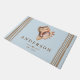 Elegant conch shell illustration in the centre. The background has a soft blue colour and personalised family name text in brown. This doormat is elegant, chic, and would make a great impression on your house guests as they are welcomed to your home!