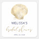 This elegant bridal shower sticker features a vintage illustration of a scallop shell in faux gold foil, above the words "bridal shower" in elegant gold coloured handwriting script. Customise the rest of the text with the name of the bride-to-be and the shower date in navy blue.